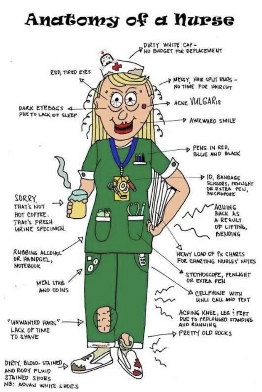 I put this photo of the “Anatomy of a Nurse” in here for a little comic relief. It’s hilarious and, at times, completely truthful. Remember that no matter which shift you chose to work, there will be benefits and downsides to each. Your attitude can make or break your shift, so be sure to approach the next 12 hours with a fresh mind. It’ll be better for your patients and yourself, trust me. Until next time, happy studying!