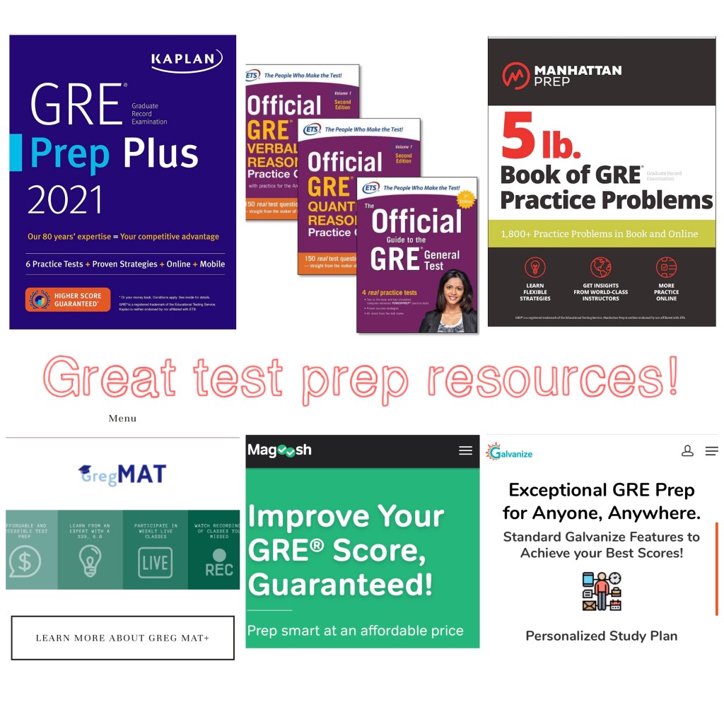 Now, let’s talk about resources for test preparation! I mainly utilized the ETS practice exams for full length review. For individual section practice and repetition, I used the 5lb Book of GRE Practice Problems to help study. Since my study time was limited and I respond well to verbal/visual teaching, I opted to watch the Magoosh GRE videos and Greg MAT review videos. Magoosh has some free videos on their app and website, but they also have additional available with a fee. Greg MAT is a site for GRE prep that costs $5 per month! I also turned to YouTube for some of the tips and tricks type of videos when I got tired of studying specific materials which is where I came across Galvanize. Kaplan I mostly used their book for memorization of the quantitative formulas. If you need a cost effective way to study, use Greg MAT and the books in the top three photos to the right.